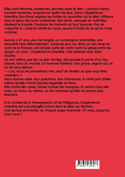 Elles sont femmes, modernes, ancrées dans le réel - parfois mères, souvent amantes, toujours en quête de plus. Dans L'expérience interdite, Eva Rossi explore les failles du quotidien où le désir affleure sous la peau des jours ordinaires. Ses récits, sensuels et maîtrisés, révèlent le trouble, l'audace, les instants où tout bascule. Pas de vulgarité ici : juste la vérité du corps, quand il brûle de ce qu'on n'ose nommer.Aurore a 27 ans, une vie rangée, un compagnon prévisible, une sexualité sans débordement. Jusqu'au jour où, dans un sex-shop du nord de la France, une simple carte de visite noire lui glisse entre les doigts. Un nom : L'expérience interdite. Une adresse mail. Rien d'autre.Le soir même, par jeu ou par vertige, elle pousse la porte d'un lieu discret, hors du monde. Un homme l'attend, voix grave, regard sûr, et lui dit sans détour :- « Ici, nous ne promettons rien, sauf de révéler ce que vous êtes vraiment. »Alors Aurore cède. Aux questions. Aux fantasmes. À cette part d'elle-même qu'elle n'avait jamais regardée en face.Elle coche des cases, laisse tomber les masques. Et rentre chez elle avec, au creux du ventre, un feu nouveau qu'elle ne pourra plus éteindre.À la croisée de la transgression et de l'élégance, L'expérience interdite est une plongée intime dans le désir au féminin.Une lecture enivrante, où chaque page murmure : Et vous, jusqu'où iriez-vous ?