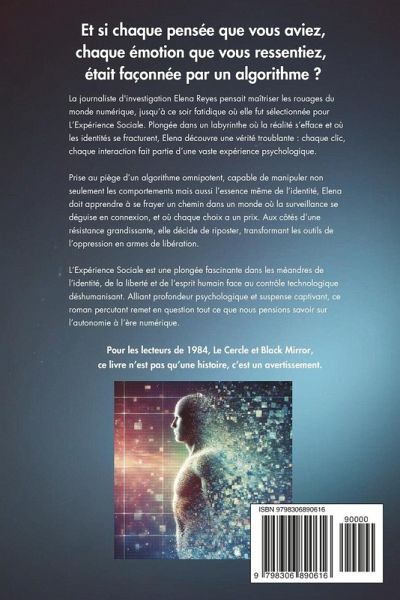 L'EXPÉRIENCE SOCIALE - Une Expérience Qui Va Changer Votre Perception de la Réalité Que vaut vraiment votre identité dans un monde où tout est observé, analysé et manipulé ? Journaliste d'investigation, Elena Reyes pensait contrôler son propre récit. Jusqu'au jour où elle reçoit une invitation mystérieuse: Bienvenue dans L'Expérience Sociale. Vous avez été choisie. Dès son premier clic, elle plonge dans un univers où la frontière entre l'observateur et l'observé s'efface. À travers un labyrinthe de données, de manipulation algorithmique et de vérités cachées, Elena découvre une réalité inquiétante: nos pensées, nos peurs et nos désirs sont devenus une marchandise. Et si vous n'étiez plus qu'un profil digital façonné par des forces invisibles ? Entre révélations troublantes et jeux de pouvoir, Elena doit choisir: Accepter les règles imposées et se fondre dans le système ? Ou déclencher une révolution silencieuse et risquer d'être effacée à jamais ? Un thriller captivant à la croisée du roman dystopique et du suspense psychologique, L'Expérience Sociale expose l'envers du décor numérique et pose une question essentielle: sommes-nous encore maîtres de nos choix ? Parfait pour les lecteurs qui aiment: Les thrillers psychologiques intelligents Les intrigues dystopiques à la Black Mirror Les réflexions sur la société numérique et le contrôle des données Ouvrez ce livre et découvrez... si vous avez vraiment le contrôle. Disponible dès maintenant. Osez l'expérience.