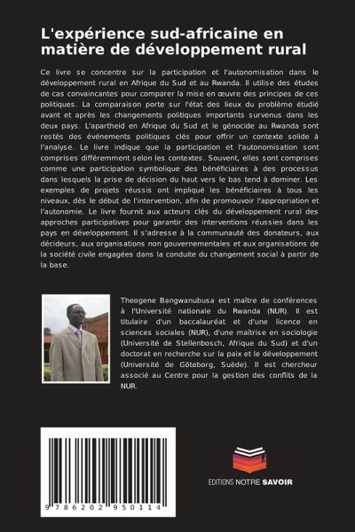 Ce livre se concentre sur la participation et l'autonomisation dans le développement rural en Afrique du Sud et au Rwanda. Il utilise des études de cas convaincantes pour comparer la mise en oeuvre des principes de ces politiques. La comparaison porte sur l'état des lieux du problème étudié avant et après les changements politiques importants survenus dans les deux pays. L'apartheid en Afrique du Sud et le génocide au Rwanda sont restés des événements politiques clés pour offrir un contexte solide à l'analyse. Le livre indique que la participation et l'autonomisation sont comprises différemment selon les contextes. Souvent, elles sont comprises comme une participation symbolique des bénéficiaires à des processus dans lesquels la prise de décision du haut vers le bas tend à dominer. Les exemples de projets réussis ont impliqué les bénéficiaires à tous les niveaux, dès le début de l'intervention, afin de promouvoir l'appropriation et l'autonomie. Le livre fournit aux acteurs clés du développement rural des approches participatives pour garantir des interventions réussies dans les pays en développement. Il s'adresse à la communauté des donateurs, aux décideurs, aux organisations non gouvernementales et aux organisations de la société civile engagées dans la conduite du changement social à partir de la base.