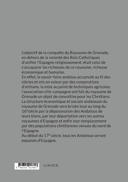 L'objectif de la conquête du Royaume de Grenade, en dehors de la volonté des Rois Catholiques d'unifier l'Espagne religieusement, était celui de s'accaparer les richesses de ce royaume, richesse économique et humaine.En effet, le savoir-faire andalou accumulé au fil des siècles et mis en valeur par des corporations d'artisans, la mise au point de techniques agricoles, l'association ville-campagne ont fait du royaume de Grenade un objet de convoitise pour les Chrétiens.La structure économique et sociale andalouse du royaume de Grenade sera brisée tout au long du 16°siècle par la dépossession des Andalous de leurs biens, par leur déportation vers les autres royaumes d'Espagne et enfin leur remplacement par des populations chrétiennes venues du nord de l'Espagne.Au début du 17° siècle, tous les Andalous seront expulsés d'Espagne.