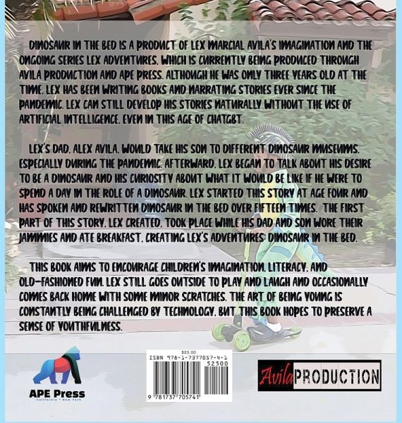 Dinosaur in the Bed is a product of Lex Marcial Avila's imagination and the ongoing series Lex Adventures, which is currently being produced through Avila Production and Ape Press. Although he was only three years old at the time, Lex has been writing books and narrating stories ever since the Pandemic. Lex can still develop his stories naturally without the use of artificial intelligence, even in this age of CHATGBT. Lex's dad, Alex Avila, would take his son to different dinosaur museums, especially during the Pandemic. Afterward, Lex began to talk about his desire to be a dinosaur and his curiosity about what it would be like if he were to spend a day in the role of a dinosaur. Lex started this story at age four and has spoken and rewritten Dinosaur in the Bed over fifteen times. The first part of this story, Lex created, took place while his dad and son wore their jammies and ate breakfast, creating Lex's Adventures: Dinosaur in the Bed. This book aims to encourage children's imagination, literacy, and old-fashioned fun. Lex still goes outside to play and laugh and occasionally comes back home with some minor scratches. The art of being young is constantly being challenged by technology, but this book hopes to preserve a sense of youthfulness.
