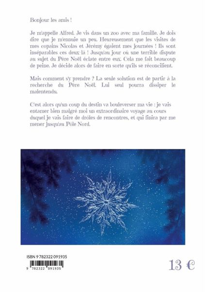 Bonjour les amis !Je m'appelle Alfred. Je vis dans un zoo avec ma famille. Je dois dire que je m'ennuie un peu. Heureusement que les visites de mes copains Nicolas et Jérémy égaient mes journées ! Ils sont inséparables ces deux-là ! Jusqu'au jour où une terrible dispute au sujet du Père Noël éclate entre eux. Cela me fait beaucoup de peine. Je décide alors de faire en sorte qu'ils se réconcilient.Mais comment s'y prendre ? La seule solution est de partir à la recherche du Père Noël. Lui seul pourra dissiper le malentendu.C'est alors qu'un coup du destin va bouleverser ma vie : je vais entamer bien malgré moi un extraordinaire voyage au cours duquel je vais faire de drôles de rencontres, et qui finira par me mener jusqu'au Pôle Nord.
