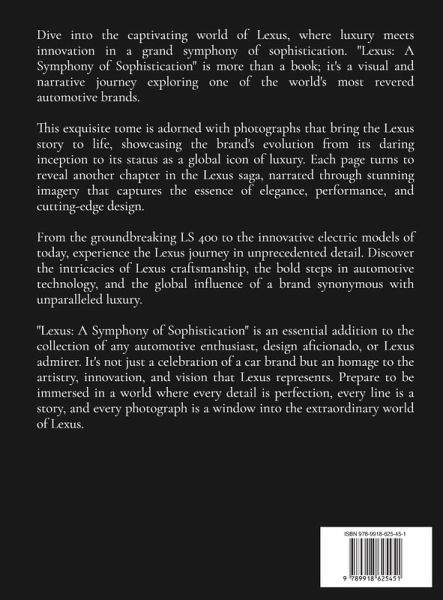 Dive into the captivating world of Lexus, where luxury meets innovation in a grand symphony of sophistication. "Lexus: A Symphony of Sophistication" is more than a book; it's a visual and narrative journey exploring one of the world's most revered automotive brands. This exquisite tome is adorned with photographs that bring the Lexus story to life, showcasing the brand's evolution from its daring inception to its status as a global icon of luxury. Each page turns to reveal another chapter in the Lexus saga, narrated through stunning imagery that captures the essence of elegance, performance, and cutting-edge design. From the groundbreaking LS 400 to the innovative electric models of today, experience the Lexus journey in unprecedented detail. Discover the intricacies of Lexus craftsmanship, the bold steps in automotive technology, and the global influence of a brand synonymous with unparalleled luxury. "Lexus: A Symphony of Sophistication" is an essential addition to the collection of any automotive enthusiast, design aficionado, or Lexus admirer. It's not just a celebration of a car brand but an homage to the artistry, innovation, and vision that Lexus represents. Prepare to be immersed in a world where every detail is perfection, every line is a story, and every photograph is a window into the extraordinary world of Lexus.