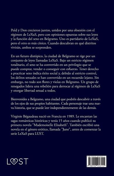 Pold y Don crecieron juntos, unidos por una obsesión con el régimen de LeXuS, pero con opiniones opuestas sobre sus leyes y la función del sexo en Belgramo. Uno es partidario de LeXuS, pero el otro es más cínico. Cuando descubran en qué distritos vivirán, ambos se sorprenden. En un futuro distópico, la ciudad de Belgramo se rige por un conjunto de leyes llamadas LeXuS. Bajo un estricto régimen totalitario, el sexo se ha convertido en un privilegio que se puede comprar, vender o conseguir con esfuerzo. Tener derecho a practicar sexo indica éxito social y, debido al estricto control, los delitos sexuales se han convertido en un recuerdo lejano. Sin embargo, no todo son flores y violas en Belgramo. Un grupo de renegados lidera una rebelión para derrocar al régimen de LeXuS y otorgar libertad sexual a todos. Bienvenides a Belgramo, una ciudad que podréis descubrir a través de los ojos de sus propios habitantes. Cada personaje trae una nueva historia, que se puede leer independientemente de las demás. Esta colección contiene: LeXuS: Pold, los renegados LeXuS: Ild & Legassov, La Pareja LeXuS: Lazare, los Parias LeXuS: Satie, el Praegressus LeXuS: Lucresia, los miserables LeXuS: Don, Los Operarios LeXuS: Azad, los Guardianes de la Justicia LeXuS: Axis, los trabajadores LeXuS: Theodora, Los Trabajadores LeXuS: Los Fundadores LeXuS: Miucha, los consumidores -