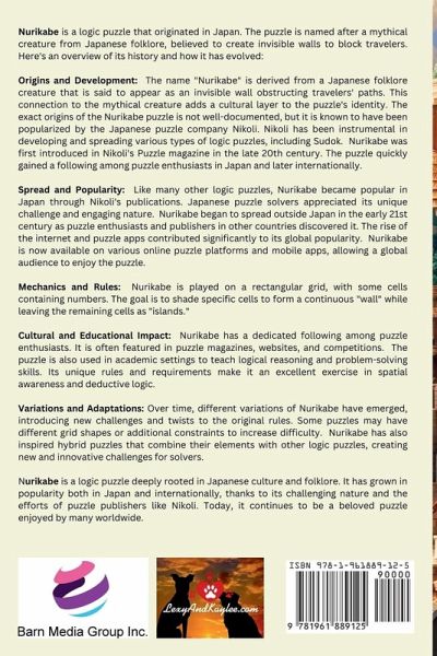 From the creators of Lexy and Kaylee's Canine Coloring Book for Children series now have put together an activity book for Adults and Teens. Inside there are 52 advanced 24x24 Nurikabe Puzzles in an easy to carry 6 x 9 format. Great for taking with you on plane and train rides or to sit at the beach or by the pool. Nurikabe is a logic puzzle that originated in Japan. The puzzle is named after a mythical creature from Japanese folklore, believed to create invisible walls to block travelers. Here's an overview of its history and how it has evolved: Origins and Development: The name "Nurikabe" is derived from a Japanese folklore creature that is said to appear as an invisible wall obstructing travelers' paths. This connection to the mythical creature adds a cultural layer to the puzzle's identity. The exact origins of the Nurikabe puzzle is not well-documented, but it is known to have been popularized by the Japanese puzzle company Nikoli. Nikoli has been instrumental in developing and spreading various types of logic puzzles, including Sudok. Nurikabe was first introduced in Nikoli's Puzzle magazine in the late 20th century. The puzzle quickly gained a following among puzzle enthusiasts in Japan and later internationally. Spread and Popularity: Like many other logic puzzles, Nurikabe became popular in Japan through Nikoli's publications. Japanese puzzle solvers appreciated its unique challenge and engaging nature. Nurikabe began to spread outside Japan in the early 21st century as puzzle enthusiasts and publishers in other countries discovered it. The rise of the internet and puzzle apps contributed significantly to its global popularity. Nurikabe is now available on various online puzzle platforms and mobile apps, allowing a global audience to enjoy the puzzle. Mechanics and Rules: Nurikabe is played on a rectangular grid, with some cells containing numbers. The goal is to shade specific cells to form a continuous "wall" while leaving the remaining cells as "islands." Cultural and Educational Impact: Nurikabe has a dedicated following among puzzle enthusiasts. It is often featured in puzzle magazines, websites, and competitions. The puzzle is also used in academic settings to teach logical reasoning and problem-solving skills. Its unique rules and requirements make it an excellent exercise in spatial awareness and deductive logic. Variations and Adaptations: Over time, different variations of Nurikabe have emerged, introducing new challenges and twists to the original rules. Some puzzles may have different grid shapes or additional constraints to increase difficulty. Nurikabe has also inspired hybrid puzzles that combine their elements with other logic puzzles, creating new and innovative challenges for solvers. Nurikabe is a logic puzzle deeply rooted in Japanese culture and folklore. It has grown in popularity both in Japan and internationally, thanks to its challenging nature and the efforts of puzzle publishers like Nikoli. Today, it continues to be a beloved puzzle enjoyed by many worldwide.