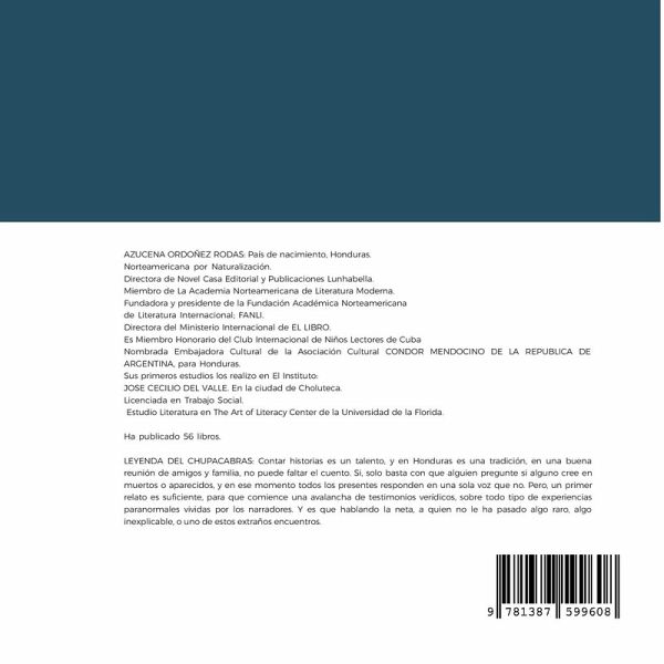 Autor: Azucena Ordoñez Rodas - Lunhabella and the blue garden- Compas of light and shadow stories collection - Moon Romance stories collection - fiction and fantasy books collections. Azucena Ordoñez Rodas From United State of America. Born in Honduras. Member of the Academy of Modern Literature. President of FANLI: North American Academic Foundation for International Literature. Director of EL LIBRO. Lic. In Social Work. Postgraduate in Modern Literature at The Art of Literacy Center of Florida University. = 26 Books published: of sale in several countries, different languages, e-book, Kindle, and paper. Novel, children's story, and poetry. Recent Posts: 2017 ROMANCE DE LUNHABELLA. (story) 2018 NINA HAS A BROTHER. (story) Music in the heart. (novel), Yhoren The Enchanted Island, 2019 The Garden of NINA. = AWARDS: 2016 SILVER FEATHER OF THE CARMEN LUISA PINTO AWARD, MEDAL OF HONOR OF THE NOBLE HOUSE OF HOMESTEAD OF THE PRINCIPALITY OF OLD ANDORRA BY PRINCE ARTHUR LOUIS PAGAN. 2016 Trophy: 1st Place children's story to Romance de Lunha. Editorial Cocoon. Trophy 3rd place Poetry by Global Distribution INC., Miami-USA International Book Fair, 2016. TROPHY TO EXCELLENCE Bruzos Award Enterprise, 2016.: Trophy to 1st Place Short Story 3rd International Literature Contest WE ARE 2017 to Romance de Lunhabella. 2017 Bruzzos Awards Trophy, for: Romance de Lunhabella. 2018 DISTINCTION TO HUMILITY and DORA ALONZO TROPHY Havana International Book Fair, Cuba 2019. ELSA AWARS, Novela 2018, MUSICA EN EL CORAZON. Medal of Honor B & N Florida I. University. TROPHY to The EXCELLENCE Authors Books Pinecrest, more published books (41) 2020 Lunhabella and The Moonlight Tales 2021 Lunhabella and The Pillars of Heaven 2022 Lunhabella and The Blue Garden 2022 Princess Lunhabella and The Pillars of Heaven, English-Spanish Lunhabella and The Blue Garden - English-Spanish