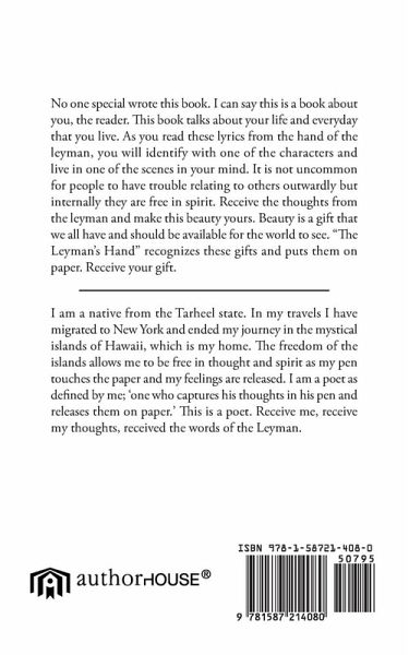 No one special wrote this book. I can say this is a book about you, the reader. This book talks about your life and everyday that you live. As you read these lyrics from the hand of the leyman, you will identify with one of the characters and live in one of the scenes in your mind. It is not uncommon for people to have trouble relating to others outwardly but internally they are free in spirit. Receive the thoughts from the leyman and make this beauty yours. Beauty is a gift that we all have and should be available for the world to see. ¿The Leyman¿s Hand¿ recognizes these gifts and puts them on paper. Receive your gift.