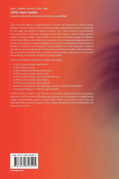 This textbook offers a comprehensive overview of research on LGBTQ-parent families. The new edition of the textbook provides updated information and expands on the range and depth of current research. The volume features contributions from scholars in psychology, sociology, human development, family studies, gender studies, sexuality studies, legal studies, social work, and anthropology. In addition, the textbook offers an international perspective, with coverage spanning many diverse nations and cultures. Chapters highlight key research, exploring sexual orientation in relation to other key social identities, such as gender, race, and nationality. Chapters also discuss new, emerging areas of research, including asexuality and immigration. The textbook concludes with a section on the growing sophistication of research methodology in the study of LGBTQ-parent families.