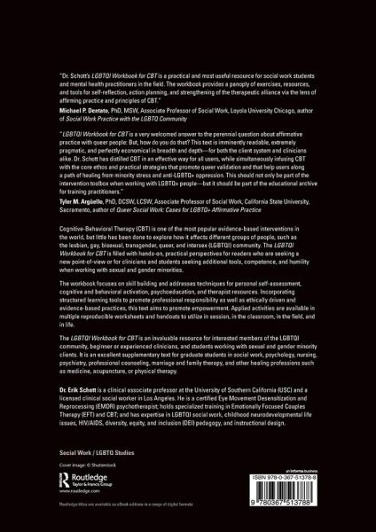 "LGBTQI Workbook for CBT is a very welcomed answer to the perennial question about affirmative practice with queer people: But, how do you do that? This text is imminently readable, extremely pragmatic, and perfectly economical in breadth and depth - for both the client system and clinicians alike. Dr. Schott has distilled CBT in an effective way for all users, while simultaneously infusing CBT with the core ethos and practical strategies that promote queer validation and that help users along a path of healing from minority stress and anti-LGBTQ+ oppression. This should not only be part of the intervention toolbox when working with LGBTQ+ people - but it should be part of the educational archive for training practitioners."