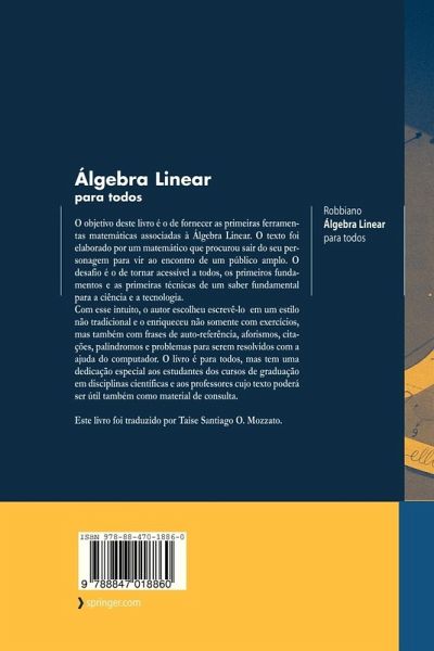 O objetivo deste livro é o de fornecer as primeiras ferramentas matemáticas associadas àÁlgebra Linear. O texto foi elaborado por um matemático que procurou "sair do seu personagem" para vir ao encontro de um público amplo. O desafio é o de tornar acessível a todos, os primeiros fundamentos e as primeiras técnicas de um saber fundamental para a ciência e a tecnologia. Com esse intuito, o autor escolheu escrevê-lo em um estilo não tradicional e o enriqueceu não somente com exercícios, mas também com frases de auto-referência, aforismos, citações, palíndromos e problemas para serem resolvidos com a ajuda do computador. O livro é para todos, mas tem uma dedicação especial aos estudantes dos cursos de graduação em disciplinas científicas e aos professores cujo texto poderá ser útil também como material de consulta.