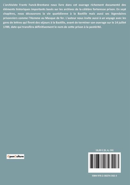 L'archiviste Frantz Funck-Brentano nous livre dans cet ouvrage richement documenté des éléments historiques importants basés sur les archives de la célèbre forteresse prison. En sept chapitres, nous découvrons la vie quotidienne à la Bastille mais aussi ses légendaires prisonniers comme l'Homme au Masque de fer. L'auteur nous invite aussi à un voyage avec les gens de lettres qui firent des séjours à la Bastille, avant de terminer son ouvrage sur le 14 juillet 1789, date qui transféra définitivement le nom de cette prison à la postérité.