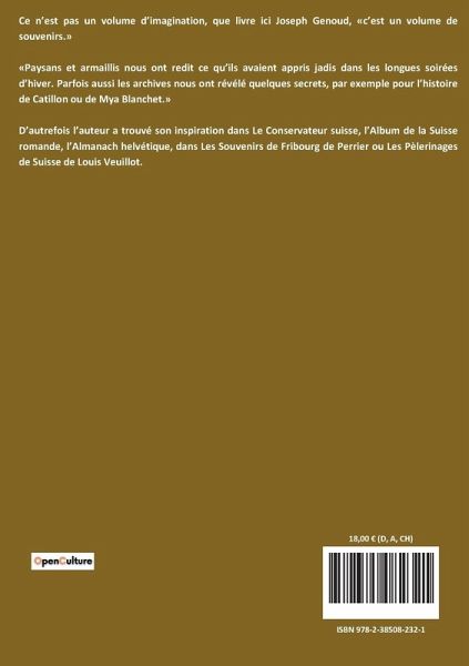 Ce n¿est pas un volume d¿imagination, que livre ici Joseph Genoud, «c¿est un volume de souvenirs.» «Paysans et armaillis nous ont redit ce qüils avaient appris jadis dans les longues soirées d¿hiver. Parfois aussi les archives nous ont révélé quelques secrets, par exemple pour l¿histoire de Catillon ou de Mya Blanchet.» D¿autrefois l¿auteur a trouvé son inspiration dans Le Conservateur suisse, l¿Album de la Suisse romande, l¿Almanach helvétique, dans Les Souvenirs de Fribourg de Perrier ou Les Pèlerinages de Suisse de Louis Veuillot.