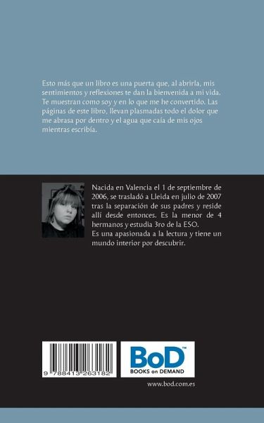 Esto más que un libro es una puerta que, al abrirla, mis sentimientos y reflexiones te dan la bienvenida a mi vida. Te muestran como soy y en lo que me he convertido. Las páginas de este libro, llevan plasmadas todo el dolor que me abrasa por dentro y el agua que caía de mis ojos mientras escribía.