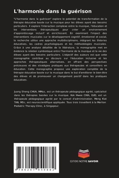 "L'harmonie dans la guérison" explore le potentiel de transformation de la thérapie éducative basée sur la musique pour les élèves ayant des besoins particuliers. Il explore l'interaction complexe entre la musique, l'éducation et les interventions thérapeutiques pour créer un environnement d'apprentissage inclusif et enrichissant. En examinant l'impact des interventions musicales sur le développement cognitif, émotionnel et social, la recherche utilise une approche multidisciplinaire, intégrant les théories éducatives, les cadres psychologiques et les méthodologies musicales. Grâce à une analyse détaillée de la littérature, la monographie met en évidence la relation symbiotique entre l'harmonie de la musique et la vie des élèves ayant des besoins particuliers. L'objectif des auteurs est que cette monographie contribue au discours sur l'éducation inclusive et les approches thérapeutiques alternatives, en offrant des perspectives précieuses et des stratégies pratiques aux thérapeutes et conseillers en éducation. Cette monographie propose une exploration complète de la thérapie éducative basée sur la musique dans le but d'améliorer le bien-être des élèves et de promouvoir un changement positif dans les pratiques éducatives.