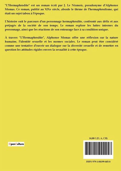 "L'Hermaphrodite" d'Alphonse Momas, publié sous le pseudonyme de J. Le Nismois, est une uvre littéraire intrigante qui plonge le lecteur dans les complexités de l'identité et de la dualité humaine. Ce deuxième tome, publié en 1902, continue d'explorer les thèmes de l'ambiguïté sexuelle et de l'acceptation sociale à travers le prisme d'un personnage central dont l'existence défie les normes établies de l'époque. Le récit est structuré en dix chapitres, chacun approfondissant les défis et les réflexions du protagoniste face à une société qui peine à accepter l'évolution des identités. L'auteur utilise une narration transitoire et descriptive pour illustrer les tensions entre l'individu et la société, tout en posant des questions sur la nature de l'identité et la fluidité des rôles de genre. À travers une prose élégante et réfléchie, Momas invite le lecteur à reconsidérer les notions de normalité et de différence, tout en offrant une critique subtile des conventions sociales de son temps. L'uvre se distingue par sa capacité à mêler introspection personnelle et commentaire social, faisant de "L'Hermaphrodite" une lecture à la fois provocante et éclairante.