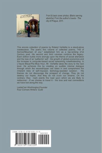 This is volume 3 in a series of epic, post-modern themes by this author. Mr. Verfaillie's earlier works give voice to the angst associated with the self-imposed isolation created in the vacuum of social networking and the growing global economy. This work continues this theme. This book of collected poems titled, "L'heure Bleue/The Blue Hour," is based upon the term that painters and photographers use to refer to twilight. It is that period of the day when the quality of ambient light creates artwork in the sky, and confirms the beauty of the world. None of us can predict with certainty, that we will see another sunrise. We can say with impunity that the sun will rise tomorrow with or without us. It is about the impermanence and the loneliness of our lives - and our acceptance of it - that the author writes. It is between pillar and post- sunrise and sunset - that we go each day until we're laid to rest. It is a time best spent either at peace with our isolation, or with someone we love beside us.