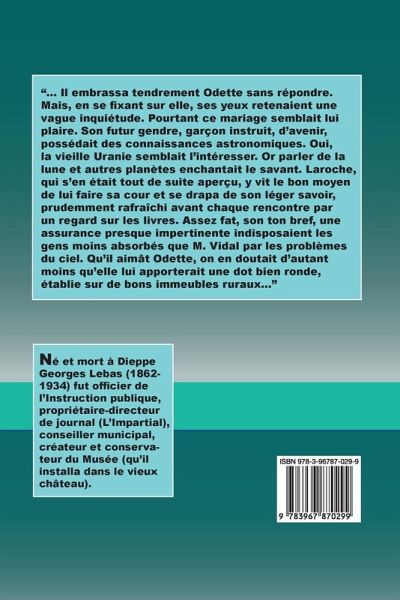 "... Il embrassa tendrement Odette sans répondre. Mais, en se fixant sur elle, ses yeux retenaient une vague inquiétude. Pourtant ce mariage semblait lui plaire. Son futur gendre, garçon instruit, d’avenir, possédait des connaissances astronomiques. Oui, la vieille Uranie semblait l’intéresser. Or parler de la lune et autres planètes enchantait le savant. Laroche, qui s’en était tout de suite aperçu, y vit le bon moyen de lui faire sa cour et se drapa de son léger savoir, prudemment rafraîchi avant chaque rencontre par un regard sur les livres. Assez fat, son ton bref, une assurance presque impertinente indisposaient les gens moins absorbés que M. Vidal par les problèmes du ciel. Qu’il aimât Odette, on en doutait d’autant moins qu’elle lui apporterait une dot bien ronde, établie sur de bons immeubles ruraux..."