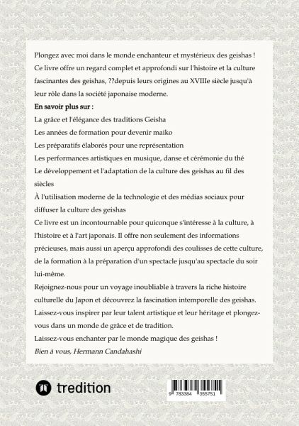 Plongez-vous dans l'histoire riche et mystérieuse des geishas avec notre dernier livre : "L'histoire des geishas au Japon - Une excursion à travers l'histoire culturelle du Japon". Ce livre offre un aperçu approfondi et complet du monde des geishas et met en évidence leur rôle important dans la culture et l'histoire japonaises.Pourquoi devriez-vous lire ce livre :Apprenez tout sur les origines des geishas, ??leur évolution au fil des siècles et leur rôle dans la société japonaise moderne.Découvrez les divers arts des geishas, ??des cérémonies du thé à la danse classique en passant par la musique et l'ikebana.Laissez-vous enchanter par des détails fascinants et des événements historiques qui donnent vie au monde des geishas.Découvrez comment les geishas opèrent dans le monde moderne, en adaptant et en préservant leurs traditions grâce à des méthodes innovantes.A qui est destiné ce livre ?Ce livre est un incontournable pour les amateurs de culture, les passionnés du Japon, les historiens, les étudiants en études japonaises et tous ceux qui sont passionnés par les arts traditionnels et les histoires exotiques. Il est parfait pour les voyageurs souhaitant explorer le Japon, ainsi que pour les universitaires et les chercheurs cherchant à mieux comprendre l'histoire culturelle japonaise.Votre voyage commence iciLaissez-vous enchanter par l'aura mystique des geishas et embarquez pour un voyage inoubliable à travers l'histoire culturelle du Japon. "L'histoire des geishas au Japon - Une excursion à travers l'histoire culturelle du Japon" est plus qu'un simple livre : c'est une porte d'entrée vers un monde plein de grâce, d'art et de tradition.Découvrez la fascination intemporelle des geishas !Bien à vous, Hermann Candahashi