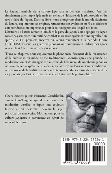 Le katana, symbole de la culture japonaise et des arts martiaux, n'est pas simplement une simple épée mais un reflet de l'histoire, de la philosophie et du savoir-faire du Japon. Dans ce livre, nous plongerons dans le monde fascinant du katana, explorerons ses origines, retracerons son évolution au fil des siècles et comprendrons son importance pour la culture japonaise jusqu'à nos jours. L'histoire du katana remonte loin dans le passé du Japon, à une époque où l'épée n'était pas seulement un outil de combat mais avait également une signification spirituelle. Les premiers ancêtres du katana remontent à la période Heian (794-1185), lorsque les guerriers japonais ont commencé à utiliser des épées ressemblant à la forme actuelle du katana. UN EXTRAIT. "Dans ce chapitre, nous explorerons le phénomène fascinant de la renaissance de la culture et du mode de vie traditionnels japonais. après une période de modernisation et de changement au cours de l'ère meiji, de nombreux japonais ont commencé à explorer leurs racines et à faire revivre leurs anciennes traditions. ce renouveau de la tradition a eu des effets considérables sur tous les aspects de la vie japonaise, de l'art et de l'artisanat à la religion et à la philosophie. après des décennies de modernisation et d'adaptation aux modes de vie occidentaux, de nombreux japonais de la seconde moitié du xxe siècle ont commencé à aspirer à leurs racines culturelles. ils ont commencé à explorer et à apprécier les anciennes traditions et coutumes de leurs ancêtres. cela faisait partie d'un mouvement mondial plus large vers un retour aux modes de vie et aux valeurs traditionnels, souvent perçus comme une réaction à la mondialisation et à l'homogénéisation culturelle..."