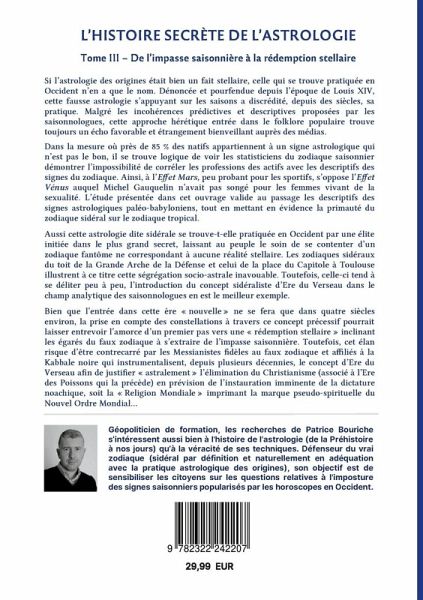 Si l'astrologie des origines était bien un fait stellaire, celle qui se trouve pratiquée en Occident n'en a que le nom. Dans la mesure où 85% des natifs appartiennent à un signe astrologique qui n'est pas le bon, il se trouve logique de voir les statisticiens du zodiaque saisonnier démontrer l'impossibilité de corréler les professions des actifs avec les descriptifs des signes du zodiaque. Ainsi, à l'Effet Mars, peu probant pour les sportifs, s'oppose l'Effet Vénus auquel Michel Gauquelin n'avait pas songé pour les femmes vivant de la sexualité. L'étude présentée dans cet ouvrage valide au passage les descriptifs des signes astrologiques paléo-babyloniens, tout en mettant en évidence la primauté du zodiaque sidéral sur le zodiaque tropical.Aussi cette astrologie dite sidérale se trouve-t-elle pratiquée en Occident par une élite initiée dans le plus grand secret, laissant au peuple le soin de se contenter d'un zodiaque fantôme ne correspondant à aucune réalité stellaire. Les zodiaques sidéraux du toit de la Grande Arche de la Défense et celui de la place du Capitole à Toulouse illustrent à ce titre cette ségrégation socio-astrale inavouable. Toutefois, celle-ci tend à se déliter peu à peu, l'introduction de concept sidéraliste d'Ere du Verseau dans le champ analytique des saisonnologues en est le meilleur exemple.Bien que l''entrée dans cette ère "nouvelle" ne se fera que dans quatre siècles environ, la prise en compte des constellations à travers ce concept précessif pourrait laisser entrevoir l'amorce d'un premier pas vers une "rédemption stellaire" inclinant les égarés du faux zodiaque à s'extraire de l'impasse saisonnière. Toutefois, cet élan risque d'être contrecarré par les Messianistes fidèles au faux zodiaque et affiliés à la Kabbale noire qui instrumentalisent, depuis plusieurs décennies, le concept d'Ere du Verseau afin de justifier "astralement" l'élimination du Christianisme (associé à l'Ere des Poissons qui la précède) en prévision de l'instauration imminente de la dictature noachique, soit la "Religion Mondiale" imprimant la marque pseudo-spirituelle du Nouvel Ordre Mondial...