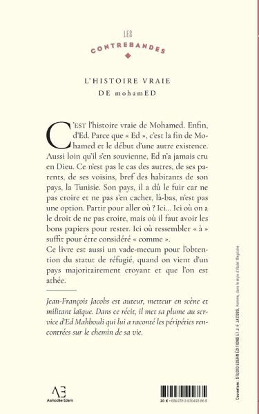 C¿est l¿histoire vraie de Mohamed. Enfin, d¿Ed. Parce que «¿Ed¿», c¿est la fin de Mohamed et le début d¿une autre existence. Aussi loin qüil s¿en souvienne, Ed n¿a jamais cru en Dieu. Ce n¿est pas le cas des autres, de ses parents, de ses voisins, bref des habitants de son pays, la Tunisie. Son pays, il a dû le fuir car ne pas croire et ne pas s¿en cacher, là-bas, n¿est pas une option. Partir pour aller où¿? Ici¿ Ici où on a le droit de ne pas croire, mais où il faut avoir les bons papiers pour rester. Ici où ressembler «¿à¿» suffit pour être considéré «¿comme¿». Ce livre est aussi un vade-mecum pour l¿obtention du statut de réfugié, quand on vient d¿un pays majoritairement croyant et que l¿on est athée. Jean-François Jacobs est auteur, metteur en scène et militant laïque. Dans ce récit, il met sa plume au service d¿Ed Mahbouli qui lui a raconté les péripéties rencontrées sur le chemin de sa vie.