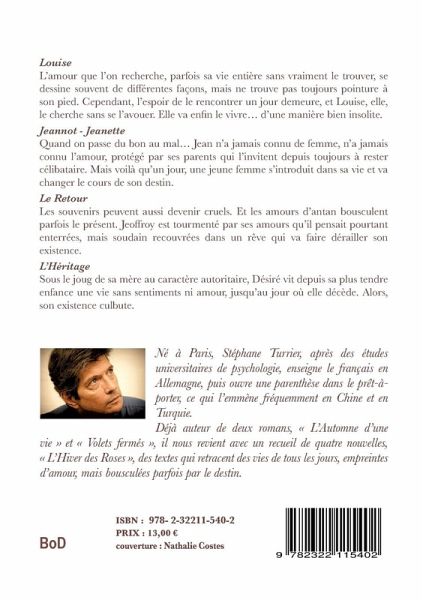 LouiseL'amour que l'on recherche, parfois sa vie entière sans vraiment le trouver, se dessine souvent de différentes façons, mais ne trouve pas toujours pointure à son pied. Cependant, l'espoir de le rencontrer un jour demeure, et Louise, elle, le cherche sans se l'avouer. Elle va enfin le vivre... d'une manière bien insolite.Jeannot - JeanetteQuand on passe du bon au mal... Jean n'a jamais connu de femme, n'a jamais connu l'amour, protégé par ses parents qui l'invitent depuis toujours à rester célibataire. Mais voilà qu'un jour, une jeune femme s'introduit dans sa vie et va changer le cours de son destin.Le RetourLes souvenirs peuvent aussi devenir cruels. Et les amours d'antan bousculent parfois le présent. Jeoffroy est tourmenté par ses amours qu'il pensait pourtant enterrées, mais soudains recouvrées dans un rêve qui va faire dérailler son existence.L'HéritageSous le joug de sa mère au caractère autoritaire, Désiré vit depuis sa plus tendre enfance une vie sans sentiments ni amour, jusqu'au jour où elle décède. Alors son existence culbute.