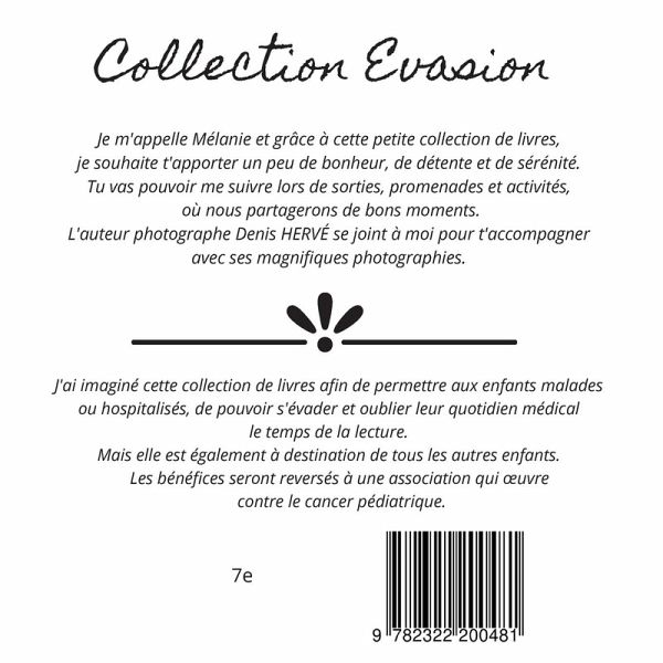 "L'hiver et son manteau blanc" de la collection Evasion, transporte l'enfant dans un paysage magnifique.Il va pouvoir ressentir le froid, toucher la neige. Observer un chasse neige en plein action... Ce petit livre est composé de textes et de magnifiques photographies qui permet à l'enfant de faire appel à ses sensations, ses souvenirs... J'ai imaginé cette collection de livres afin de permettre aux enfants malades ou hospitalisés, de pouvoir s'évader et oublier leur quotidien médical le temps de la lecture. Mais elle est également à destination de tous les autres enfants. La totalité des bénéfices seront reversés à une association qui oeuvre contre le cancer pediatrique.