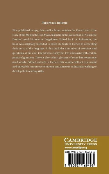 First published in 1915, this small volume contains the French text of the story of the Man in the Iron Mask, taken from the last section of Alexandre Dumas' novel Vicomte de Bragelonne. Edited by E. A. Robertson, the book was originally intended to assist students of French in cementing their grasp of the language. It thus includes a number of exercises and questions at the end, intended to clarify the text and assist with certain points of grammar. There is also a short glossary of some less commonly used words. Printed entirely in French, this volume will act as a useful and enjoyable resource for students and amateur enthusiasts wishing to develop their reading skills.
