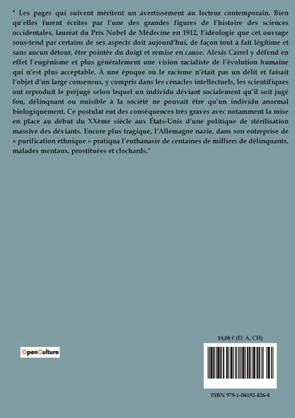 " Les pages qui suivent méritent un avertissement au lecteur contemporain. Bien qüelles furent écrites par l¿une des grandes figures de l¿histoire des sciences occidentales, lauréat du Prix Nobel de Médecine en 1912, l¿idéologie que cet ouvrage sous-tend par certains de ses aspects doit aujourd¿hui, de façon tout à fait légitime et sans aucun détour, être pointée du doigt et remise en cause. Alexis Carrel y défend en effet l¿eugénisme et plus généralement une vision racialiste de l¿évolution humaine qui n¿est plus acceptable. À une époque où le racisme n¿était pas un délit et faisait l¿objet d¿un large consensus, y compris dans les cénacles intellectuels, les scientifiques ont reproduit le préjugé selon lequel un individu déviant socialement qüil soit jugé fou, délinquant ou nuisible à la société ne pouvait être qüun individu anormal biologiquement. Ce postulat eut des conséquences très graves avec notamment la mise en place au début du XXème siècle aux États-Unis d¿une politique de stérilisation massive des déviants. Encore plus tragique, l¿Allemagne nazie, dans son entreprise de « purification ethnique » pratiqua l¿euthanasie de centaines de milliers de délinquants, malades mentaux, prostituées et clochards."