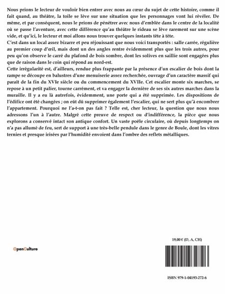 Nous prions le lecteur de vouloir bien entrer avec nous au c¿ur du sujet de cette histoire, comme il fait quand, au théâtre, la toile se lève sur une situation que les personnages vont lui révéler. De même, et par conséquent, nous le prions de pénétrer avec nous d¿emblée dans le centre de la localité où se passe l¿aventure, avec cette différence qüau théâtre le rideau se lève rarement sur une scène vide, et qüici, le lecteur et moi allons nous trouver quelques instants tête à tête. C¿est dans un local assez bizarre et peu réjouissant que nous voici transportés : salle carrée, régulière au premier coup d¿¿il, mais dont un des angles rentre évidemment plus que les trois autres, pour peu qüon observe le carré du plafond de bois sombre, dont les solives en saillie sont engagées plus que de raison dans le coin qui répond au nord-est. Cette irrégularité est, d¿ailleurs, rendue plus frappante par la présence d¿un escalier de bois dont la rampe se découpe en balustres d¿une menuiserie assez recherchée, ouvrage d¿un caractère massif qui paraît de la fin du XVIe siècle ou du commencement du XVIIe. Cet escalier monte six marches, se repose à un petit palier, tourne carrément, et va engager la dernière de ses six autres marches dans la muraille. Il y a eu là autrefois, évidemment, une porte qui a été supprimée. Les dispositions de l¿édifice ont été changées ; on eût dû supprimer également l¿escalier, qui ne sert plus qüà encombrer l¿appartement. Pourquoi ne l¿a-t-on pas fait ? Telle est, cher lecteur, la question que nous nous adressons l¿un à l¿autre. Malgré cette preuve de respect ou d¿indifférence, la pièce que nous explorons a conservé intact son antique confort. Un vaste poêle circulaire, où depuis longtemps on n¿a pas allumé de feu, sert de support à une très-belle pendule dans le genre de Boule, dont les vitres ternies et presque irisées par l¿humidité envoient dans l¿ombre des reflets métalliques.