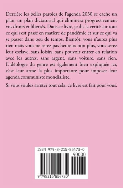 Derrière les belles paroles de l'agenda 2030 se cache un plan, un plan dictatorial qui éliminera progressivement vos droits et libertés. Dans ce livre, je dis la vérité sur tout ce qui s'est passé en matière de pandémie et sur ce qui va se passer dans peu de temps. Bientôt, vous n'aurez plus rien mais vous ne serez pas heureux non plus, vous serez leur esclave, sans loisirs, sans pouvoir entrer en relation avec les autres, sans argent, sans voiture, sans rien. L'idéologie du genre est également bien expliquée ici, c'est leur arme la plus importante pour imposer leur agenda communiste mondialiste. Si vous voulez arrêter tout cela, ce livre est fait pour vous.
