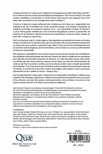 L'espèce humaine va-t-elle pouvoir s'adapter aux changements qu'elle a elle-même suscités ? En a-t-elle encore les moyens physiologiques et biologiques ? Est-il encore temps ? Sur quel secteur scientifique, économique ou social allons-nous pouvoir nous appuyer à l'avenir pour nous aider dans une phase où les changements du monde seront multiples ?Le monde, l'homme l'a rendu nettement plus vivable pour lui-même en y augmentant son espérance de vie, en facilitant ses accès au garde-manger, à la fontaine municipale, au médecin de famille, à la pompe à essence, au train ou à... ses redoutables e-mails. Ce faisant il a, d'un même geste, multiplié par cent sa facture énergétique comme sa production de carbone et de polluants, pillé les ressources halieutiques, érodé les terres arables, homogénéisé le vivant et, peut-être, mangé son pain blanc.Tout n'est pas joué, mais il y a bien urgence ! Les régulations qui animent le monde sont de plus en plus contraintes et l'on sait désormais que l'accumulation des savoirs (d'Internet notamment) ne donne pour autant la capacité d'agir ! Et pourtant, si l'humain touche effectivement tous ses "plafonds" (physiologiques, biologiques, environnementaux, sociaux, économiques, etc.) cette situation ne sera pas supportable.Loin de propos culpabilisants mais à partir de leurs travaux les plus récents, des scientifiques, de tout bord, tentent d'apporter des esquisses de réponses. Au-delà des idées reçues, leurs textes constituent des liens tissés, entre les sciences de la nature, les sciences fondamentales, les sciences de l'homme et de la société, pour nous dresser un bilan aussi complet que possible de la situation. Car s'il est acquis que l'activité humaine est le principal moteur de l'évolution de la planète, il convient désormais trouver des moyens pour protéger l'espèce humaine contre ses propres agissements et modérer sa soif du "toujours plus".C'est pour répondre à cette quête que cet ouvrage a été rédigé. S'adressant un public de scie