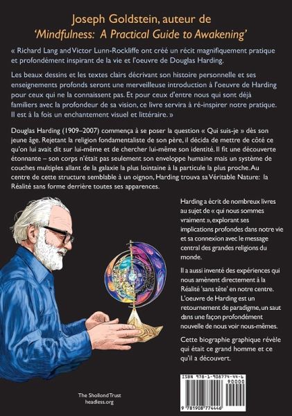 Douglas Harding (1909-2007) commença à se poser la question »Qui suis-je » dès son jeune âge. Rejetant la religion fondamentaliste de son père, il décida de mettre de côté ce qu’on lui avait dit sur lui-même et de chercher lui-même son identité. Il fit une découverte étonnante - son corps n’était pas seulement son enveloppe humaine mais un système de couches multiples allant de la galaxie la plus lointaine à la particule la plus proche. Au centre de cette structure semblable à un oignon, Harding trouva sa Véritable Nature: la Réalité sans forme derrière toutes ses apparences. Harding a écrit de nombreux livres au sujet de « qui nous sommes vraiment », explorant ses implications profondes dans notre vie et sa connection avec le message central des grandes religions du monde. Il a aussi inventé des expériences qui nous amènent directement à la Réalité ‘sans tête’ en notre centre. L’oeuvre de Harding est un retournement de paradigme, un saut dans une façon profondément nouvelle de nous voir nous-mêmes. Cette biographie graphique révèle qui était ce grand homme et ce qu’il a découvert.