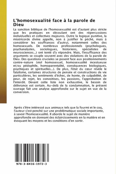 La sanction biblique de l'homosexualité est d'autant plus stricte que les pratiques en découlant ont des répercussions individuelles et collectives majeures. Outre la logique punitive, la miséricorde divine appelle, non à justifier le péché, mais à considérer les souffrances d'autrui, notamment celles des homosexuels. De nombreux professionnels (psychologues, psychanalystes, sociologues, historiens, spécialistes de neurosciences...) ont tenté d'y répondre. Mais, l'insuffisance des arguments se couple souvent avec des violations de la parole de Dieu. Des questions cruciales se posent face aux positionnements contre-nature (viol homosexuel, homosexualité incestueuse et/ou pédophile, homoparentalité, conséquences biologiques, psychiques et spirituelles...). De plus, l'état du coeur révèle le fatalisme, certaines structures de pensée et constructions de vie particulières, les sentiments d'échec, de honte, de culpabilité, de peur, de rejet, les convoitises, les passions, l'approbationde l'interdit. Devant cette liste non exhaustive, le besoin de délivrance est certain. Au-delà de la condamnation, le présent ouvrage fait une analyse approfondie sur le sujet en vue de la conversion.