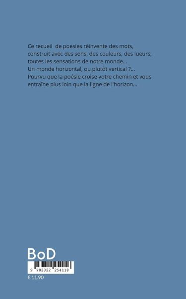Ce recueil de poésies réinvente des mots, construit avec des sons, des couleurs, des lueurs, toutes les sensations de notre monde... Un monde horizontal, ou plutôt vertical ?... Pourvu que la poésie croise votre chemin et vous entraîne plus loin que la ligne de l'horizon...