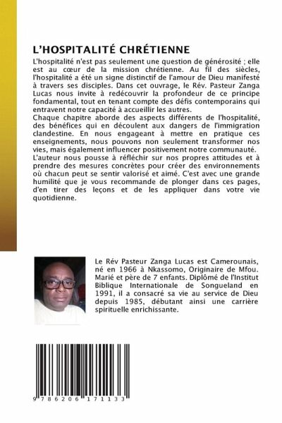 L'hospitalité n'est pas seulement une question de générosité ; elle est au coeur de la mission chrétienne. Au fil des siècles, l'hospitalité a été un signe distinctif de l'amour de Dieu manifesté à travers ses disciples. Dans cet ouvrage, le Rév. Pasteur Zanga Lucas nous invite à redécouvrir la profondeur de ce principe fondamental, tout en tenant compte des défis contemporains qui entravent notre capacité à accueillir les autres.Chaque chapitre aborde des aspects différents de l'hospitalité, des bénéfices qui en découlent aux dangers de l'immigration clandestine. En nous engageant à mettre en pratique ces enseignements, nous pouvons non seulement transformer nos vies, mais également influencer positivement notre communauté.L'auteur nous pousse à réfléchir sur nos propres attitudes et à prendre des mesures concrètes pour créer des environnements où chacun peut se sentir valorisé et aimé. C'est avec une grande humilité que je vous recommande de plonger dans ces pages, d'en tirer des leçons et de les appliquer dans votre vie quotidienne.