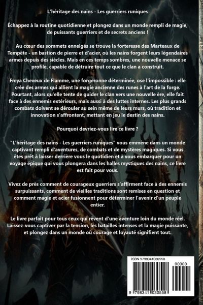 L'héritage des nains - Les guerriers runiques Échappez à la routine quotidienne et plongez dans un monde rempli de magie, de puissants guerriers et de secrets anciens ! Au coeur des sommets enneigés se trouve la forteresse des Marteaux de Tempête - un bastion de pierre et d'acier, où les nains forgent leurs légendaires armes depuis des siècles. Mais en ces temps sombres, une nouvelle menace se profile, capable de détruire tout ce que le clan a construit. Freya Cheveux de Flamme, une forgeronne déterminée, ose l'impossible: elle crée des armes qui allient la magie ancienne des runes à l'art de la forge. Pourtant, alors qu'elle tente de guider le clan vers une nouvelle ère, elle fait face à des ennemis extérieurs, mais aussi à des luttes internes. Les plus grands combats doivent se dérouler au sein même de leurs murs, où tradition et innovation s'affrontent, mettant en jeu le destin des nains. Pourquoi devriez-vous lire ce livre ? "L'héritage des nains - Les guerriers runiques" vous emmène dans un monde captivant rempli d'aventures, de combats et de mystères magiques. Si vous êtes prêt à laisser derrière vous le quotidien et à vous embarquer pour un voyage épique qui vous plongera dans les halles mystiques des nains, ce livre est fait pour vous. Vivez de près comment de courageux guerriers s'affirment face à des ennemis surpuissants, comment de vieilles traditions sont remises en question et comment magie et acier fusionnent pour déterminer l'avenir d'un peuple entier. Le livre parfait pour tous ceux qui rêvent d'une aventure loin du monde réel. Laissez-vous captiver par la tension, les batailles intenses et la magie puissante, et plongez dans un monde où courage et loyauté signifient tout.