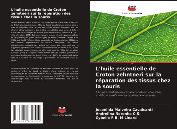 Croton zehntneri Pax at Hoffm est une plante que l'on trouve dans le nord-est du Brésil, principalement dans l'État du Ceará, populairement connue sous le nom de canela-de-cunhã, où elle est utilisée comme édulcorant pour les aliments et les boissons, et ses feuilles sont utilisées sous forme de thés et d'infusions pour soulager les troubles gastro-intestinaux (Craveiro et al., 1977 ; Craveiro et al., 1978). Selon des rapports locaux, elle est également utilisée en cataplasme pour guérir certains types de lésions cutanées. Oliveira et al. (2001) ont étudié l'effet de l'huile essentielle de Croton zehntneri (OECz) sur des modèles expérimentaux de douleur, démontrant une activité antinociceptive indiquant des actions au niveau des sites centraux, et suggérant également une activité anti-inflammatoire (OLIVEIRA et al., 2001). Ces résultats peuvent indiquer un effet cicatrisant de l'OECz sur les plaies cutanées, puisque la réponse inflammatoire est une condition préalable au processus de réparation des tissus (Porto et al., 2007). Ce travail a été réalisé dans le laboratoire de physiologie expérimentale de l'université d'État du Ceará.