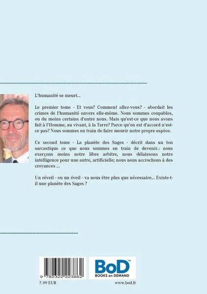 L'humanité se meurt...Le premier tome - Et vous? Comment allez-vous? - abordait les crimes de l'humanité envers elle-même. Nous sommes coupables, ou du moins certains d'entre nous. Mais qu'est-ce que nous avons fait à l'Homme, au vivant, à la Terre? Parce qu'on est d'accord n'est-ce pas? Nous sommes en train de faire mourir notre propre espèce.Ce second tome - La planète des Sages - décrit dans un ton sarcastique ce que nous sommes en train de devenir.: nous exerçons moins notre libre arbitre, nous délaissons notre intelligence pour une autre, artificielle; nous nous accrochons à des croyances ...Un réveil - ou un éveil ! - va nous être plus que nécessaire...
