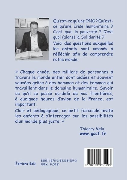 Qu'est-ce qu'une ONG ? Qu'est-ce qu'une crise humanitaire ? C'est quoi la pauvreté ? C'est quoi (alors) la Solidarité ?Voici des questions auxquelles les enfants sont amenés à réfléchir afin de comprendre notre monde.« Chaque année, des milliers de personnes à travers le monde entier sont aidées et souvent sauvées grâce à des hommes et des femmes qui travaillent dans le domaine humanitaire. Savoir ce qu'il se passe au-delà de nos frontières, à quelques heures d'avion de la France, est important.Clair et pédagogique, ce petit fascicule invite les enfants à s'interroger sur les possibilités d'un monde plus juste. »Thierry Velu.www.gscf.fr