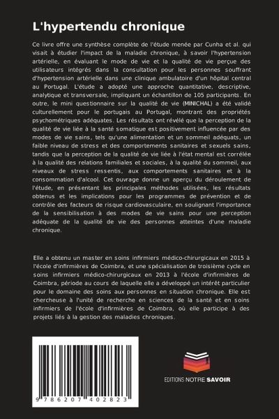 Ce livre offre une synthèse complète de l'étude menée par Cunha et al. qui visait à étudier l'impact de la maladie chronique, à savoir l'hypertension artérielle, en évaluant le mode de vie et la qualité de vie perçue des utilisateurs intégrés dans la consultation pour les personnes souffrant d'hypertension artérielle dans une clinique ambulatoire d'un hôpital central au Portugal. L'étude a adopté une approche quantitative, descriptive, analytique et transversale, impliquant un échantillon de 105 participants. En outre, le mini questionnaire sur la qualité de vie (MINICHAL) a été validé culturellement pour le portugais au Portugal, montrant des propriétés psychométriques adéquates. Les résultats ont révélé que la perception de la qualité de vie liée à la santé somatique est positivement influencée par des modes de vie sains, tels qu'une alimentation et un sommeil adéquats, un faible niveau de stress et des comportements sanitaires et sexuels sains, tandis que la perception de la qualité de vie liée à l'état mental est corrélée à la qualité des relations familiales et sociales, à la qualité du sommeil, aux niveaux de stress ressentis, aux comportements sanitaires et à la consommation d'alcool. Cet ouvrage donne un aperçu du déroulement de l'étude, en présentant les principales méthodes utilisées, les résultats obtenus et les implications pour les programmes de prévention et de contrôle des facteurs de risque cardiovasculaire, en soulignant l'importance de la sensibilisation à des modes de vie sains pour une perception adéquate de la qualité de vie des personnes atteintes d'une maladie chronique.