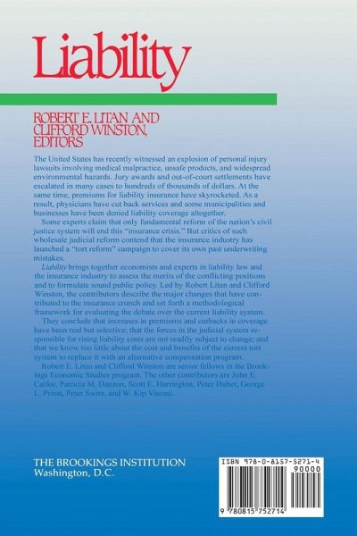 " The United States has recently witnessed an explosion of personal injury lawsuits involving medical malpractice, unsafe products, and widespread environmental hazards. Jury awards and out-of-court settlements have escalated in many cases to hundreds of thousands of dollars. At the same time, premiums for liability insurance have skyrocketed. As a result, physicians have cut back services and some municipalities and businesses have been denied liability coverage altogether. Some experts claim that only fundamental reform of the nation's civil justice system will end this ""insurance crisis."" But critics of such wholesale judicial reform contend that the insurance industry has launced a ""tort reform"" campaign to cover its own past underwriting mistakes. Liability brings together economists and experts in liability law and the insurance industry to assess the merits of the conflicting positions and to formulate sound public policy. Led by Robert Litan and Clifford Winston, the contributors describe the major changes that have contributed to the insurance crunch and set forth a methodological framework for evaluating the debate over the current liability system. They conclude that increases in premiums and cutbacks in coverage have been real but selective; that the forces in the judicial system responsible for rising liability costs are not readily subject to change; and that we know too little about the cost and benefits of the current tort system to replace it with an alternative compensation program."