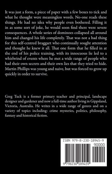 It was just a form, a piece of paper with a few boxes to tick and what he thought were meaningless words. No-one reads these things. He had no idea why people even bothered. Filling it in as some sort of joke, he would soon find there were severe consequences. A whole series of dominoes collapsed all around him and changed his life completely. That was not a bad thing for this self-centred braggart who continually sought attention and thought he knew it all. That one form that he filled in at the end of his police training, with its innocuous lie led to a whirlwind of events where he met a wide range of people who had their own secrets and their own lies that they tried to hide. Martin Phillips was young and naive, but was forced to grow up quickly in order to survive.