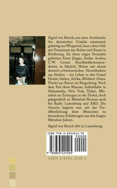 Aus einer Arztfamilie des fränkischen Uradels stammend, gebürtig aus Wuppertal, kam die Autorin schon früh mit Prominenz aus Kultur und Kunst in Berührung. Zu ihren engen Freunden gehörten Ernst Jünger, Stefan Andres, C.W. Ceram und manche andere bedeutende Persönlichkeit. Rundfunkkorrespondentin in Madrid, Heirat mit einem deutsch-schweizerischen Hoteldirektor aus Sizilien - ein Leben in Grand Hotels von Italien, in Afrika, im Mittleren Osten, dazu viele Reisen. Flucht aus Beirut im Bürgerkrieg. Nach dem Tod ihres Mannes Aufenthalte in Südamerika, New York, Türkei, Mitarbeit an Zeitungen in der Türkei, doch gelegentlich zu Mittelost-Themen auch bei Radio Luxemburg und ARD. Mit ihrem Buch "Libanon - warum es geschah. Das Rezept eines Bürgerkrieges" (2005) begann die Autorin mit der Veröffentlichung ihrer Memoiren zu außergewöhnlichen Erfahrungen mitunter brisanter Thematik aus den langen Mittelost-Jahren. Auch 2010 setzte sie die Reihe mit ihrem Hauptwerk WARTEN AUF SCHEICH ABDUL-AZIZ (3 Bände), an dem sie zehn Jahre schrieb, fort. Nach Luxemburg und Berlin lebt Sigrid von Broich nun in der Kaiserstadt Aachen, der Stadt ihrer Vorfahren.
