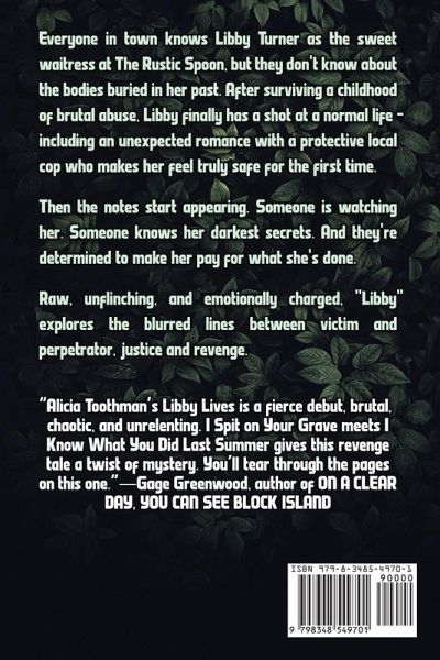 Everyone in town knows Libby Turner as the sweet waitress at The Rustic Spoon, but they don't know about the bodies buried in her past. After surviving a childhood of brutal abuse, Libby finally has a shot at a normal life - including an unexpected romance with a protective local cop who makes her feel truly safe for the first time. Then the notes start appearing. Someone is watching her. Someone knows her darkest secrets. And they're determined to make her pay for what she's done. Raw, unflinching, and emotionally charged, "Libby" explores the blurred lines between victim and perpetrator, justice and revenge. "Ali Toothman's Libby Lives is a fierce debut, brutal, chaotic, and unrelenting. I Spit On Your Grave meets I Know What You Did Last Summer gives this revenge tale a twist of mystery. You'll tear through the pages of this one." --Gage Greenwood, author of ON A CLEAR DAY, YOU CAN SEE BLOCK ISLAND "An impressive debut that's as much of a blood-soaked revenge fantasy as it is a meditation on the morality of justified violence." --Nick Roberts, author of MEAN SPIRITED and THE EXORCIST'S HOUSE "Toothman makes it clear she isn't afraid to explore dark places in her writing. Libby Lives is a gripping tale of revenge, love, and overcoming a harrowing past. Highly recommended!" --John Durgin, author of THE CURSED AMONG US and KOSA "Ali Toothman delivers a punch in her debut book. A revenge story that is easily read in one sitting. Brutal, unfiltered, and raw." --Mike Salt, author of YOU'RE NOT SUPPOSED TO BE HERE "A twisty and intense tale of feminine rage and brutal exacted revenge. Libby Lives is a satisfying testament to 'FAFO'. Toothman has secured a foothold in the genre with this exhilarating debut." --Megan Stockton, author of LOVELY, DARK, AND DEEP