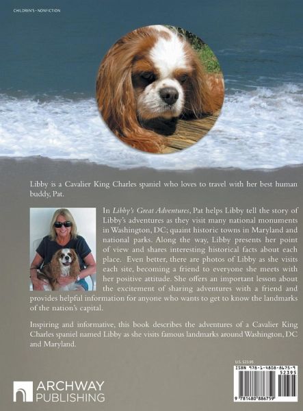 Libby is a Cavalier King Charles spaniel who loves to travel with her best human buddy, Pat. In Libby's Great Adventures, Pat helps Libby tell the story of Libby's adventures as they visit many national monuments in Washington, DC; quaint historic towns in Maryland and national parks. Along the way, Libby presents her point of view and shares interesting historical facts about each place. Even better, there are photos of Libby as she visits each site, becoming a friend to everyone she meets with her positive attitude. She offers an important lesson about the excitement of sharing adventures with a friend and provides helpful information for anyone who wants to get to know the landmarks of the nation's capital. Inspiring and informative, this book describes the adventures of a Cavalier King Charles spaniel named Libby as she visits famous landmarks around Washington, DC and Maryland.