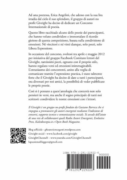 Ad una poetessa, Erica Angelini, che adesso con la sua lira irradia dal cielo il suo splendore, il gruppo di autori no profit Giveight ha deciso di dedicare un Concorso Internazionale di poesia. Questo libro racchiude alcune delle poesie dei partecipanti, che hanno voluto condividere e immortalare il ricordo gioioso di questa competizione di condivisione di emozioni. Né vincitori e né vinti dunque, solo poeti, solo Libera Espressione. In occasione del concorso, svoltosi a maggio 2012 per iniziativa del gruppo Facebook Comitato lettori del Giveight, tantissimi poeti, ognuno con il proprio stile, hanno regalato versi ed emozioni inimmaginabili. L'entusiasmo dei concorrenti, unito alla voglia di comunicare tramite l'espressione poetica, è stato talmente forte che il Giveight ha deciso di dare a tutti i partecipanti la possibilità di veder pubblicate le proprie poesie.