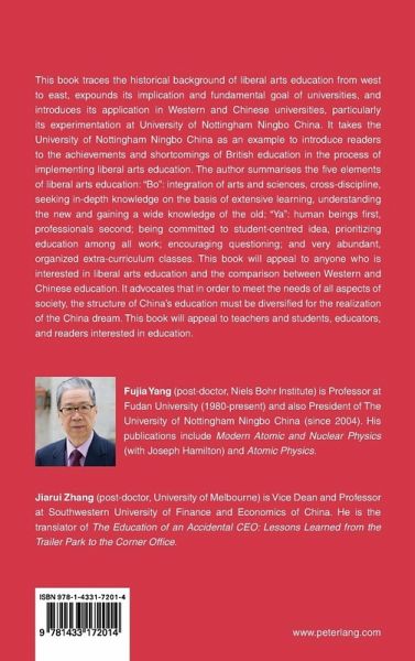 This book traces the historical background of liberal arts education from west to east, expounds its implication and fundamental goal of universities, and introduces its application in Western and Chinese universities, particularly its experimentation at University of Nottingham Ningbo China. It takes the University of Nottingham Ningbo China as an example to introduce readers to the achievements and shortcomings of British education in the process of implementing liberal arts education. The author summarises the five elements of liberal arts education: "Bo": integration of arts and sciences, cross-discipline, seeking in-depth knowledge on the basis of extensive learning, understanding the new and gaining a wide knowledge of the old; "Ya": human beings first, professionals second; being committed to student-centred idea, prioritizing education among all work; encouraging questioning; and very abundant, organized extra-curriculum classes. This book will appeal to anyone who is interested in liberal arts education and the comparison between Western and Chinese education. It advocates that in order to meet the needs of all aspects of society, the structure of China's education must be diversified for the realization of the China dream. This book will appeal to teachers and students, educators, and readers interested in education.
