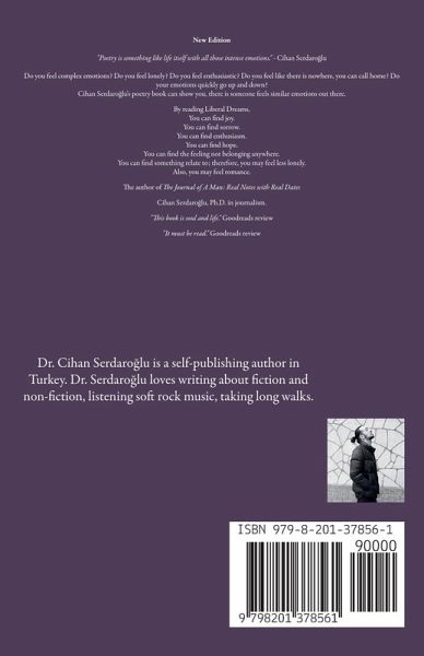 New Edition "Poetry is something like life itself with all those intense emotions." - Cihan Serdarölu Do you feel complex emotions? Do you feel lonely? Do you feel enthusiastic? Do you feel like there is nowhere, you can call home? Do your emotions quickly go up and down? Cihan Serdarölu's poetry book can show you, there is someone feels similar emotions out there. By reading Liberal Dreams, You can find joy. You can find sorrow. You can find enthusiasm. You can find hope. You can find the feeling not belonging anywhere. You can find something relate to; therefore, you may feel less lonely. Also, you may feel romance. The author of The Journal of A Man: Real Notes with Real Dates Cihan Serdarölu, Ph.D. in journalism. "This book is soul and life." Goodreads review "It must be read." Goodreads review Scroll up to buy this book and start reading today!
