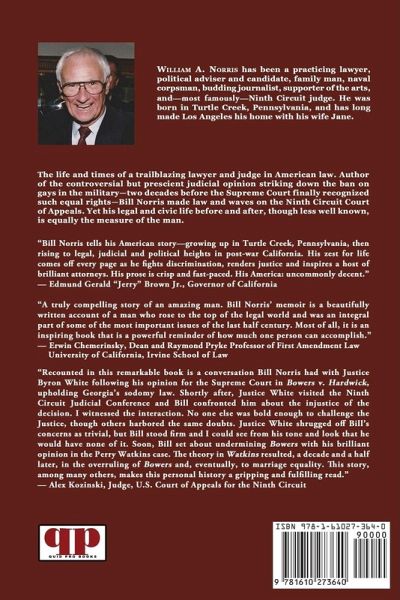 The life and times of a trailblazing lawyer and judge in American law. Author of the controversial but prescient judicial opinion striking down the ban on gays in the military - two decades before the Supreme Court finally recognized such equal rights - Bill Norris made law and waves on the Ninth Circuit Court of Appeals. Yet his legal and civic life before and after, though less well known, is equally the measure of the man. "Bill Norris tells his American story-growing up in Turtle Creek, Pennsylvania, then rising to legal, judicial and political heights in post-war California. His zest for life comes off every page as he fights discrimination, renders justice and inspires a host of brilliant attorneys. His prose is crisp and fast-paced. His America: uncommonly decent." - Edmund Gerald "Jerry" Brown Jr., Governor of California "A truly compelling story of an amazing man. Bill Norris' memoir is a beautifully written account of a man who rose to the top of the legal world and was an integral part of some of the most important issues of the last half century. Most of all, it is an inspiring book that is a powerful reminder of how much one person can accomplish." - Erwin Chemerinsky, Dean and Raymond Pryke Professor of First Amendment Law University of California, Irvine School of Law "Recounted in this remarkable book is a conversation Bill Norris had with Justice White following his opinion for the Supreme Court in Bowers v. Hardwick, upholding Georgia's sodomy law. Shortly after, Justice White visited the Ninth Circuit Judicial Conference and Bill confronted him about the injustice of the decision. I witnessed the interaction. No one else was bold enough to challenge the Justice, though others harbored the same doubts. Justice White shrugged off Bill's concerns as trivial, but Bill stood firm and I could see from his tone and look that he would have none of it. Soon, Bill set about undermining Bowers with his brilliant opinion in the Perry Watkins case. The theory in Watkins resulted, a decade and a half later, in the overruling of Bowers and, eventually, to marriage equality. This story, among many others, makes this personal history a gripping and fulfilling read." - Alex Kozinski, Judge, U.S. Court of Appeals for the Ninth Circuit "Liberal Opinions traces William Norris' journey from a small Pennsylvania town to influential Los Angeles civic leader and co-founder of the Museum of Contemporary Art to the Ninth Circuit Court bench. With candor and deep reflection, Norris shares the personal stories and principles that helped propel him from humble beginnings to becoming a leading liberal voice for our country." - Eli Broad, philanthropist and founding chairman of MOCA "When it comes to MOCA, this is a story at the edge of Hollywood drama and true philanthropy, and civic engagement and true commitment to the art. MOCA's conception is the living proof that art, contemporary art, risk taking, and commitment to aesthetic experimentations are a key component of civic, courageous urban development. And because we are in Los Angeles, it had to be a good story fueled with drama!" - Philippe Vergne, Director, The Museum of Contemporary Art New in the Journeys & Memoirs Series from Quid Pro Books.